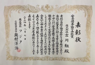 フジタ様より、安全優秀協力会社として、